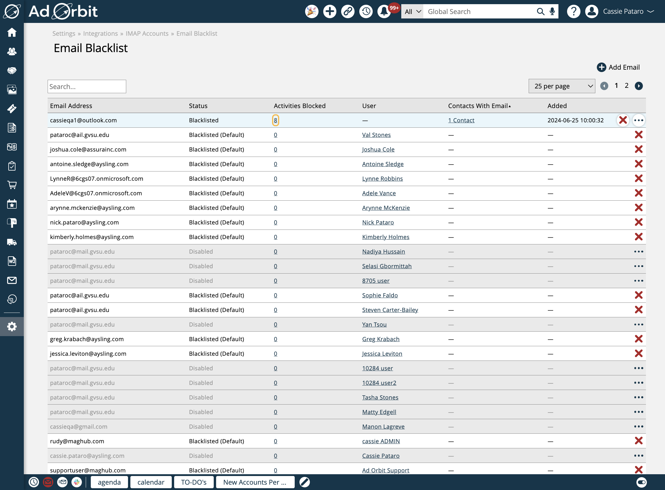When automatically adding emails as activities within Ad Orbit, you may have email addresses that you want to be excluded. This is where the Email Blacklist comes into play. The Email Blacklist functionality allows you to add specific email addresses that you never want to sync when pulling your emails into Ad Orbit. For example, you may not want your personal emails between you and your lawyer or doctor to be brought into Ad Orbit as activities, even if there are contacts in Ad Orbit with those email addresses. The Email Blacklist makes this possible.