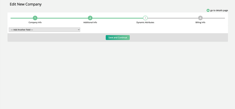 When you have finished filling out at least the required fields on this page, you have two options. You can either click ‘Create and View’, or ‘Create and Continue’. All of the necessary information to create a company is on this first step, so if you click Create and View, the record will get created in your system, and you will be brought to the company’s overview page. If you click Create and Continue, the company record will still be created, but you’ll be brought to the next step of the company creation process. The information on the following steps is not required, but can be helpful for further customizing your company and making sure all of its contacts and billing information is set up properly.