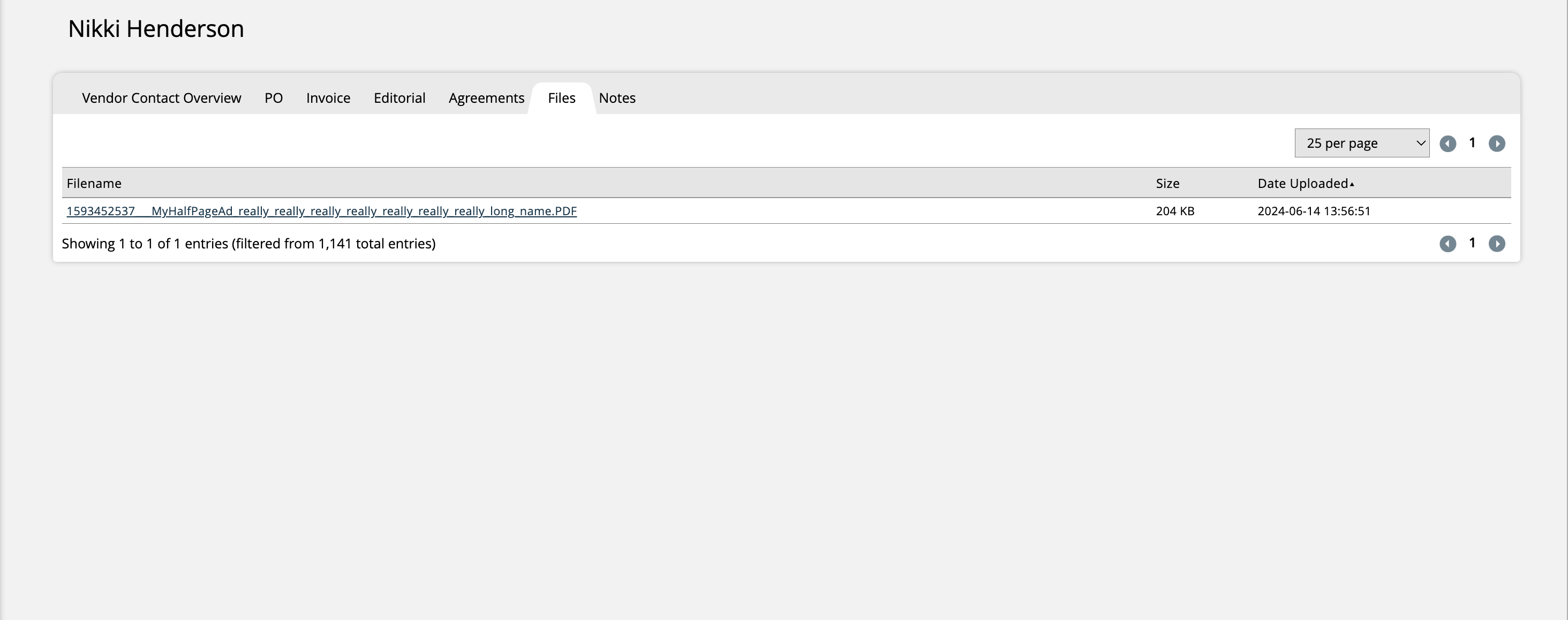 Within the Vendor Center, your vendors have the ability to upload files to their My Account page. Any files uploaded there will show up in their Files tab in Ad Orbit. Click on the file name to open it in a new tab.