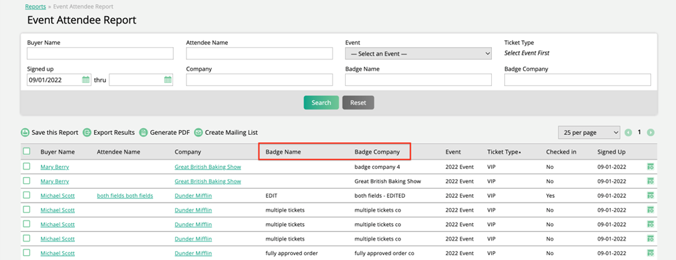 Both the Event Attendee Report and an event’s Attendees tab will show the badge information as display fields. This allows you to easily view an attendee’s name and company data from the system and compare it to their badge names. The Event Attendee Report also has search fields for Badge Name and Badge Company.