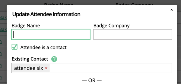 If a contact is assigned to the attendee record, but no badge name is entered, the contact name will display in the Badge Name field.
