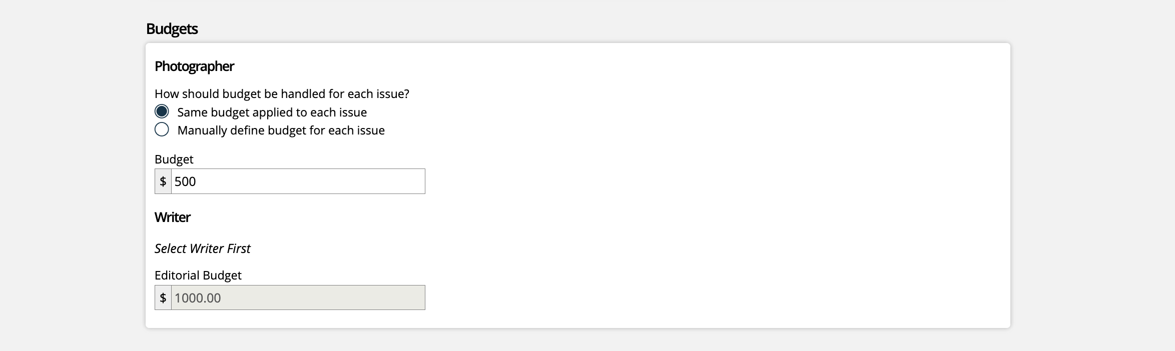 The first option is to apply the same budget to every issue. For example, on this editorial, I have two issues. When I use this option, and enter a budget of $500, my total editorial budget is $1000, or $500 for each issue.