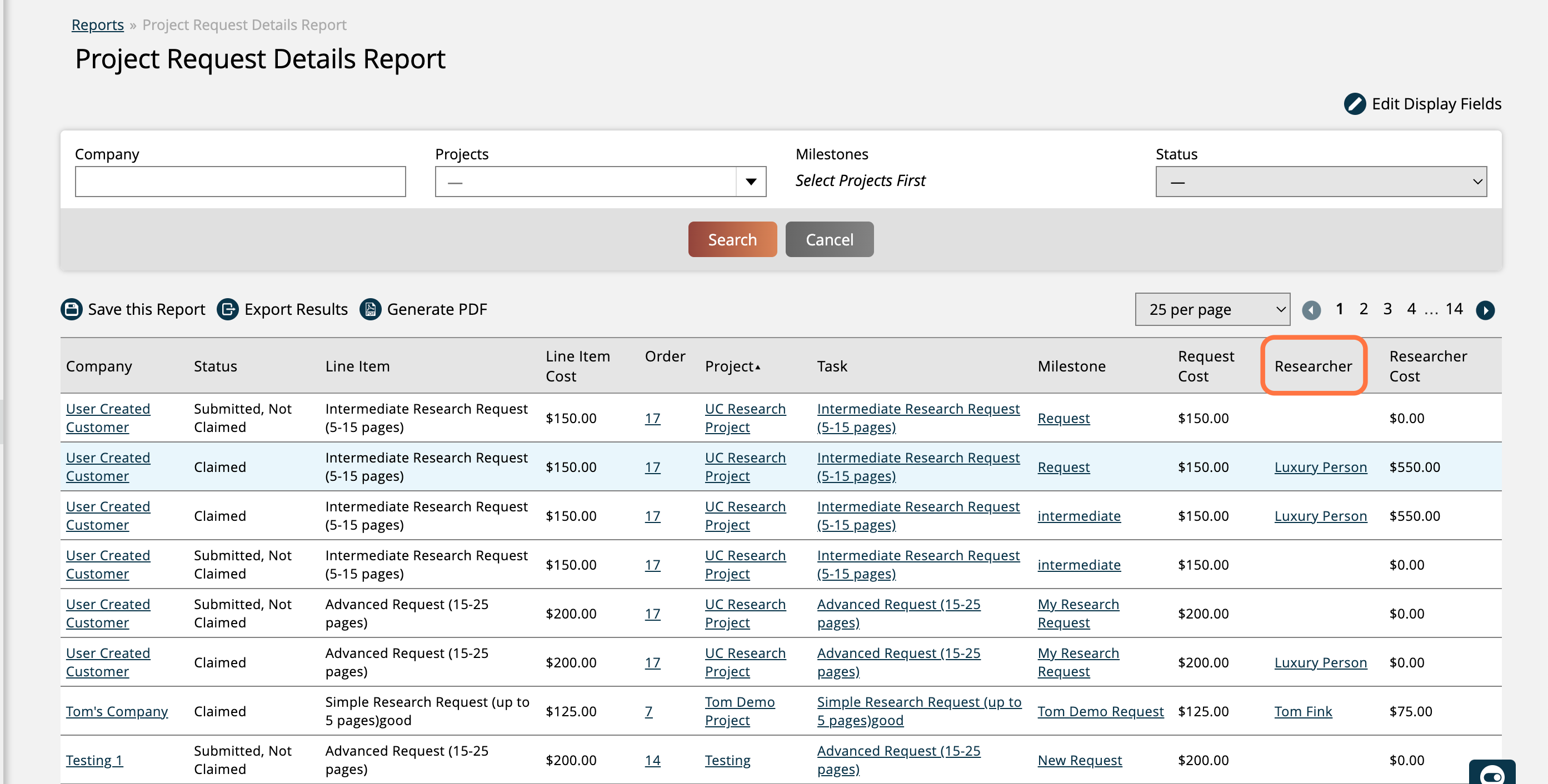 Researcher Cost is the pricing list cost associated with the vendor contact assigned to the request.