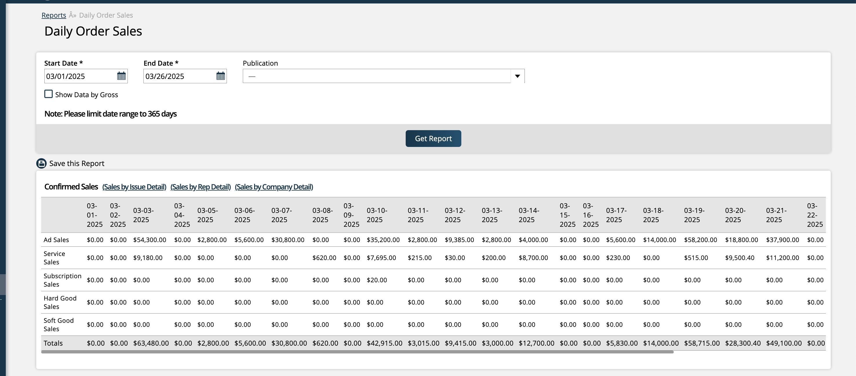 There are two main tables displayed in the body of the report: Confirmed Sales and Contract Sales. Confirmed Sales are any sales that have reached the 100% approval level, whereas Contract Sales include pending items. The tables will show the sales made in a handful of categories, such as Ad, Service, Subscription, etc., for each day in the date range searched, as well as showing daily totals. Under each of the main tables, you may also choose to display Issue Detail, Rep Detail, or Company Detail tables.
