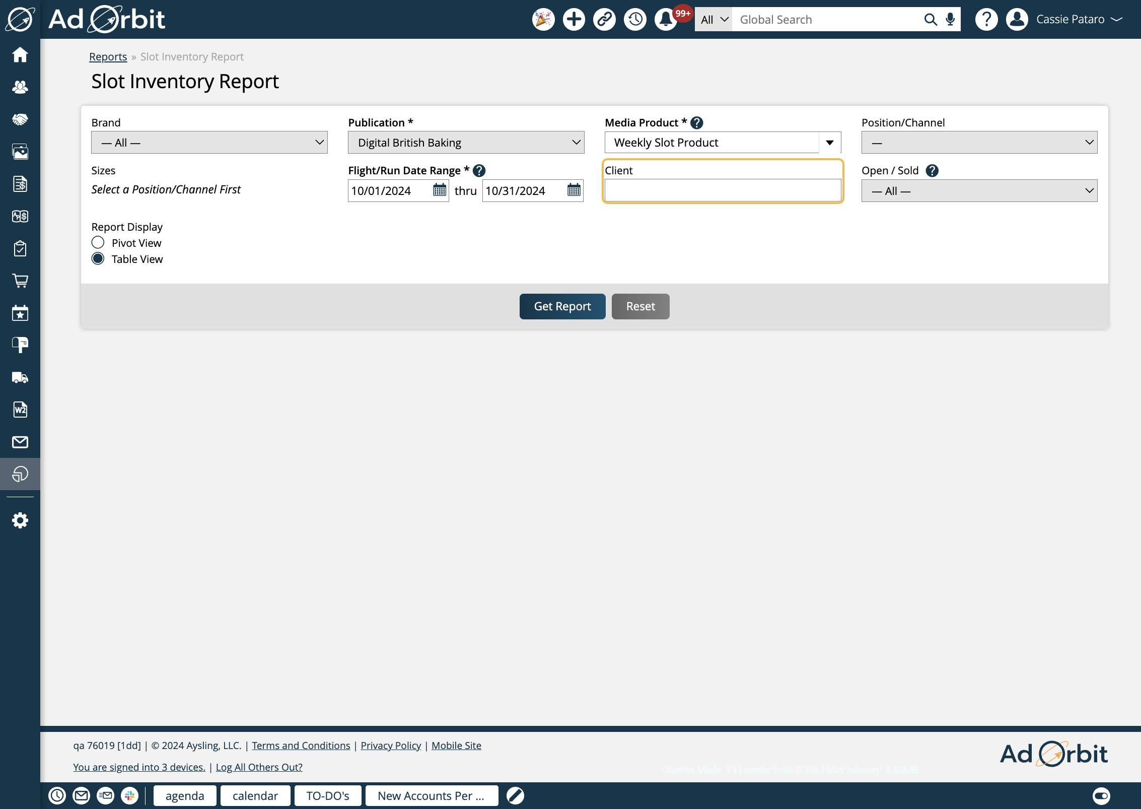 The Slot Inventory Report shows what inventory is available based on the frequency of your slot products and what has been sold. The report finds available, pending, and sold information based on the inventory set for each product searched. The data can be viewed in either a pivot or table format.