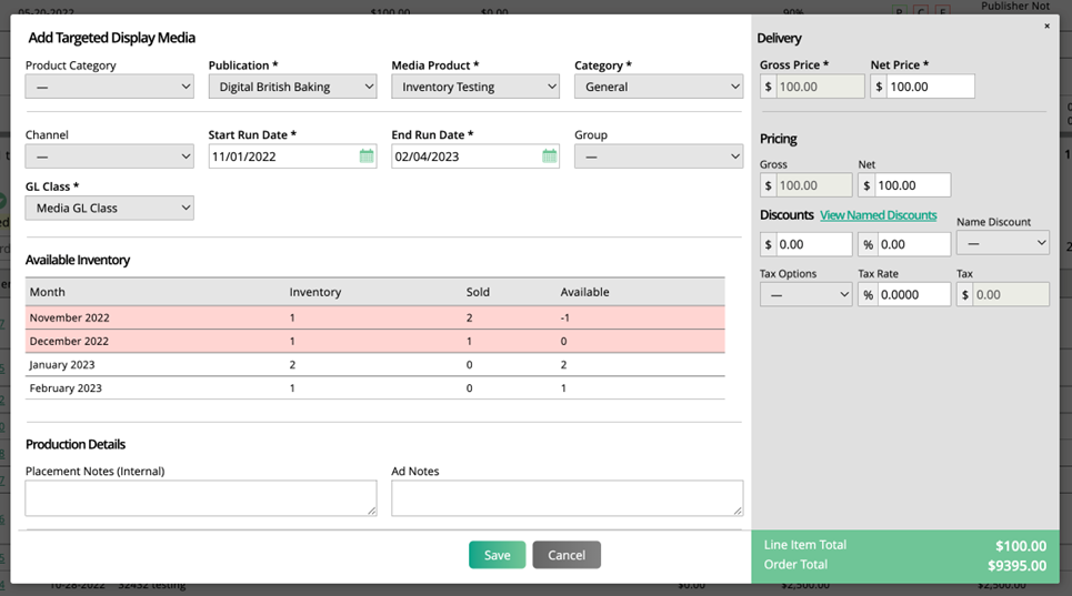 If you have inventory set up on your Targeted Display product, you’ll see an Available Inventory table display after you enter the required fields. This table will show the sold and available inventory for each month the product spans. Depending on your permissions, you may or may not be able to add an oversold item to the order.