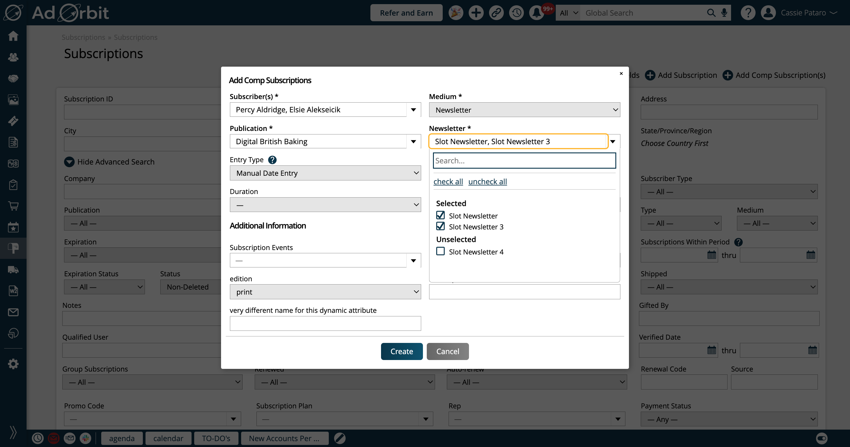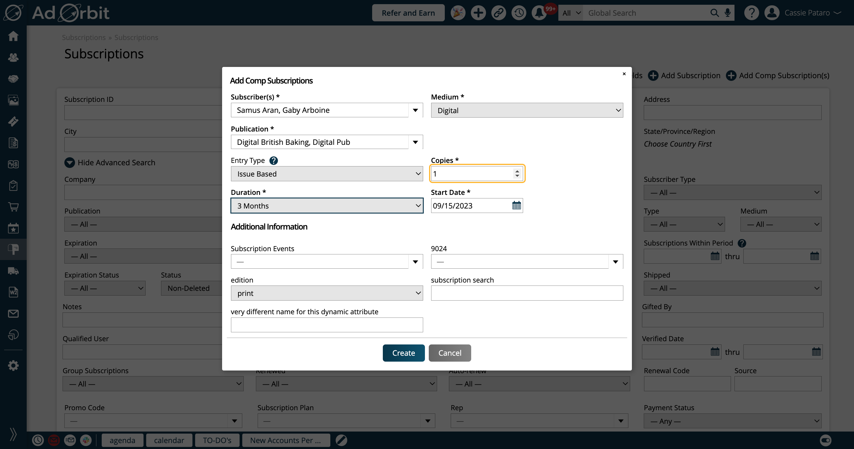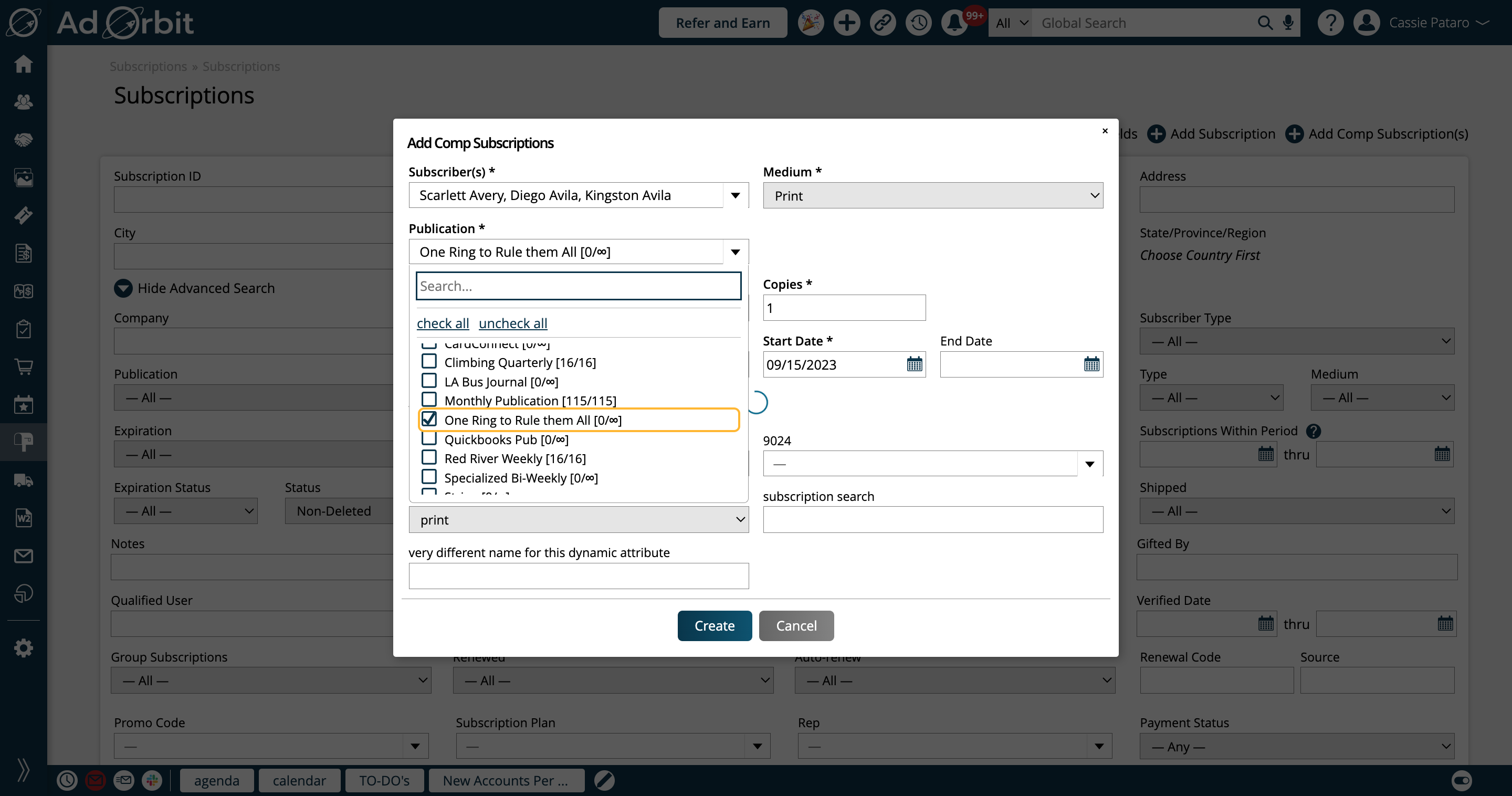 There are a few locations within the system where you can create comp subscriptions in bulk. This quick add popup allows you to create subscriptions for multiple subscribers and publications at one time.