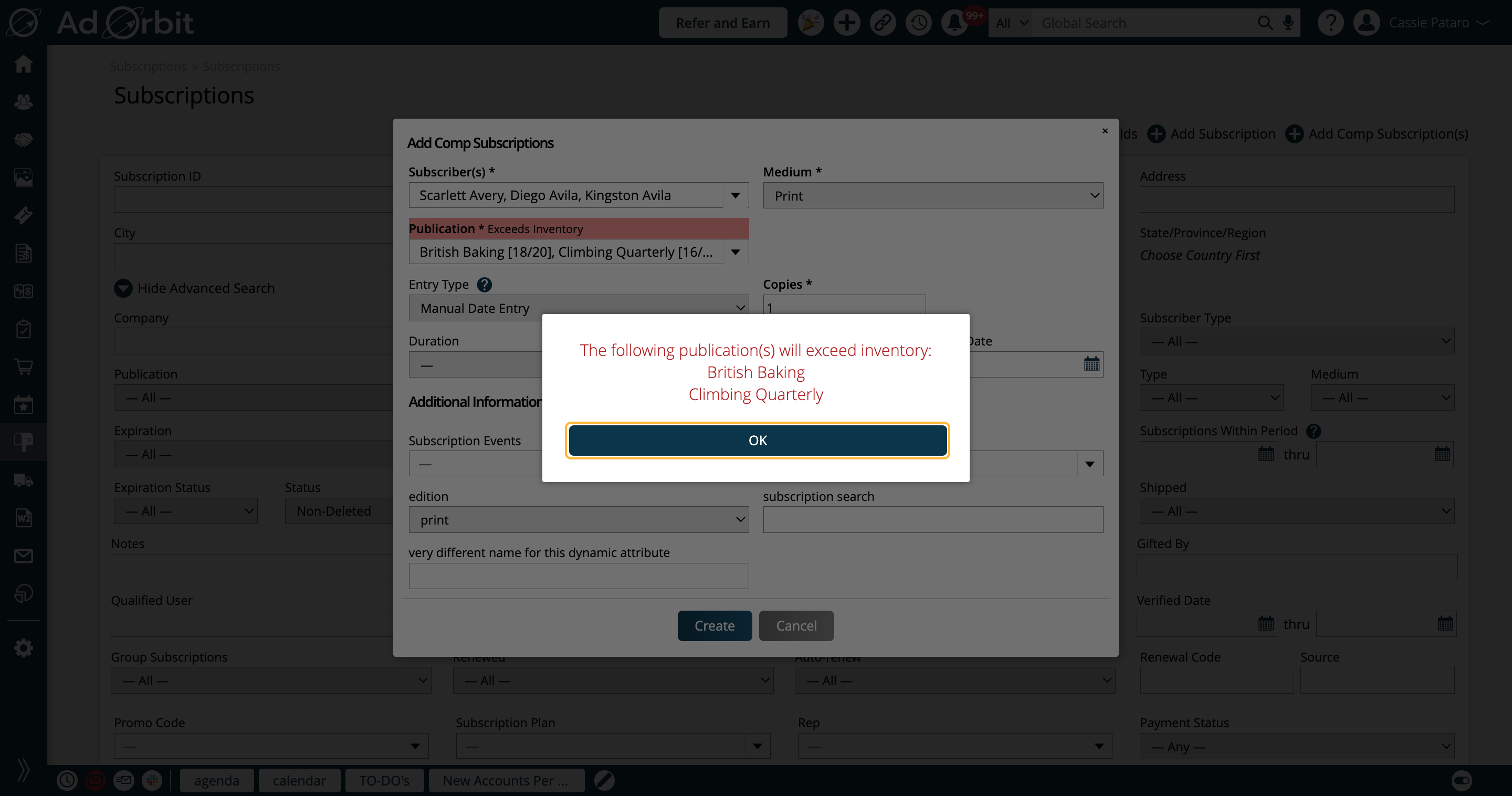 If you attempt to create subscriptions that will exceed the comp inventory set on one of the publications, you will get a notification and will need to make the necessary changes in order to create the subscriptions.