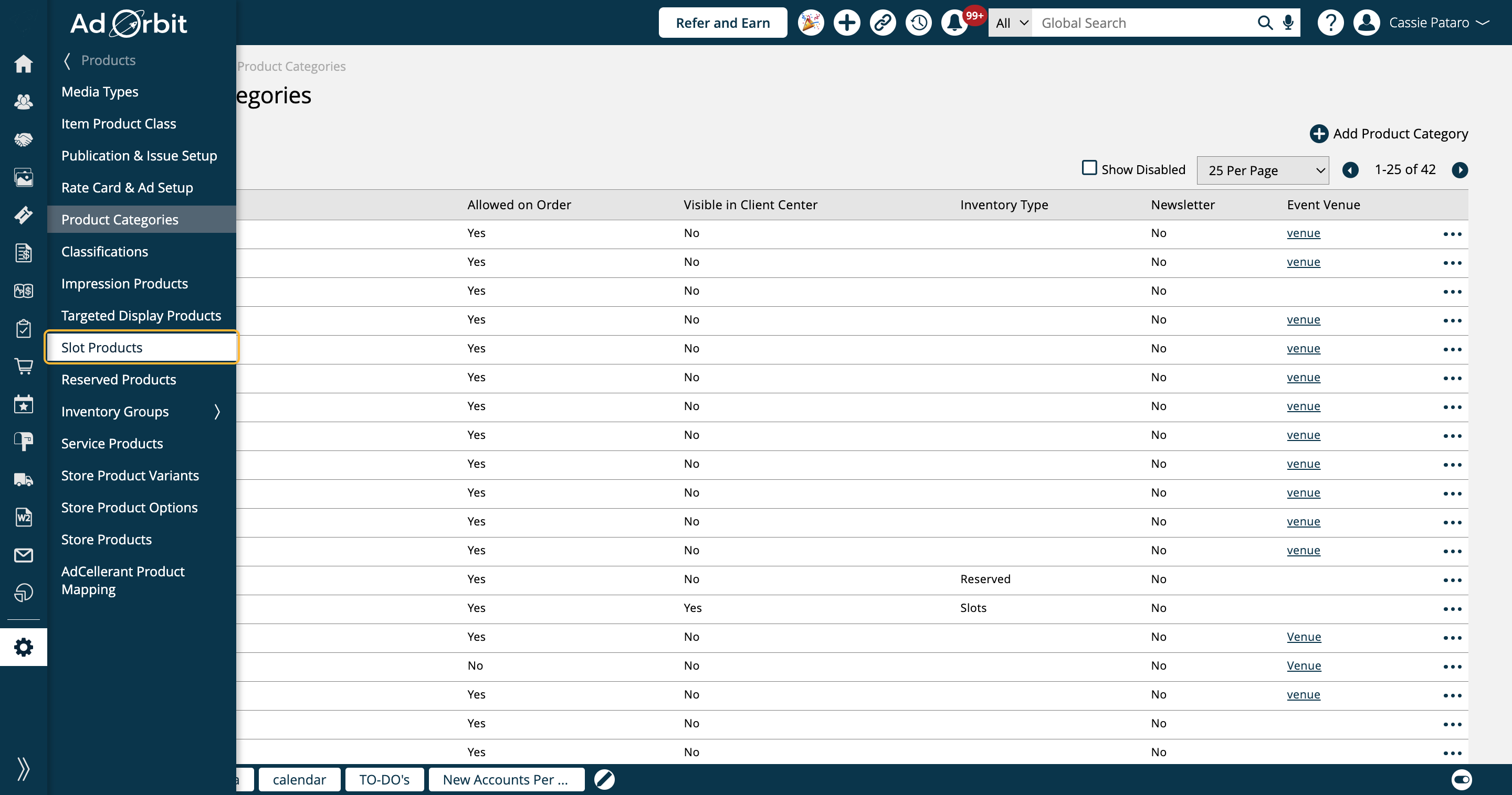 Newsletters are subscriptions which must be tied to a slot product. To set up a product to use as a newsletter subscription, begin by going to your Product Categories. Click on Settings.