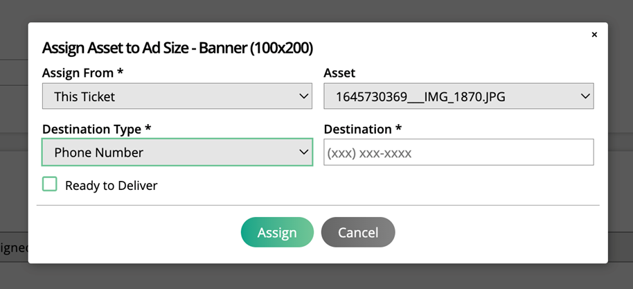 At the bottom of the ticket page, you will see an Assign to Ad Size section. Click the plus icon on a size to assign an asset to that size. In the popup, you can either use a file uploaded directly to the ticket or can pick up a file from a previous ticket. You will also need to choose the destination type (URL or phone number) and enter the website or phone number.
