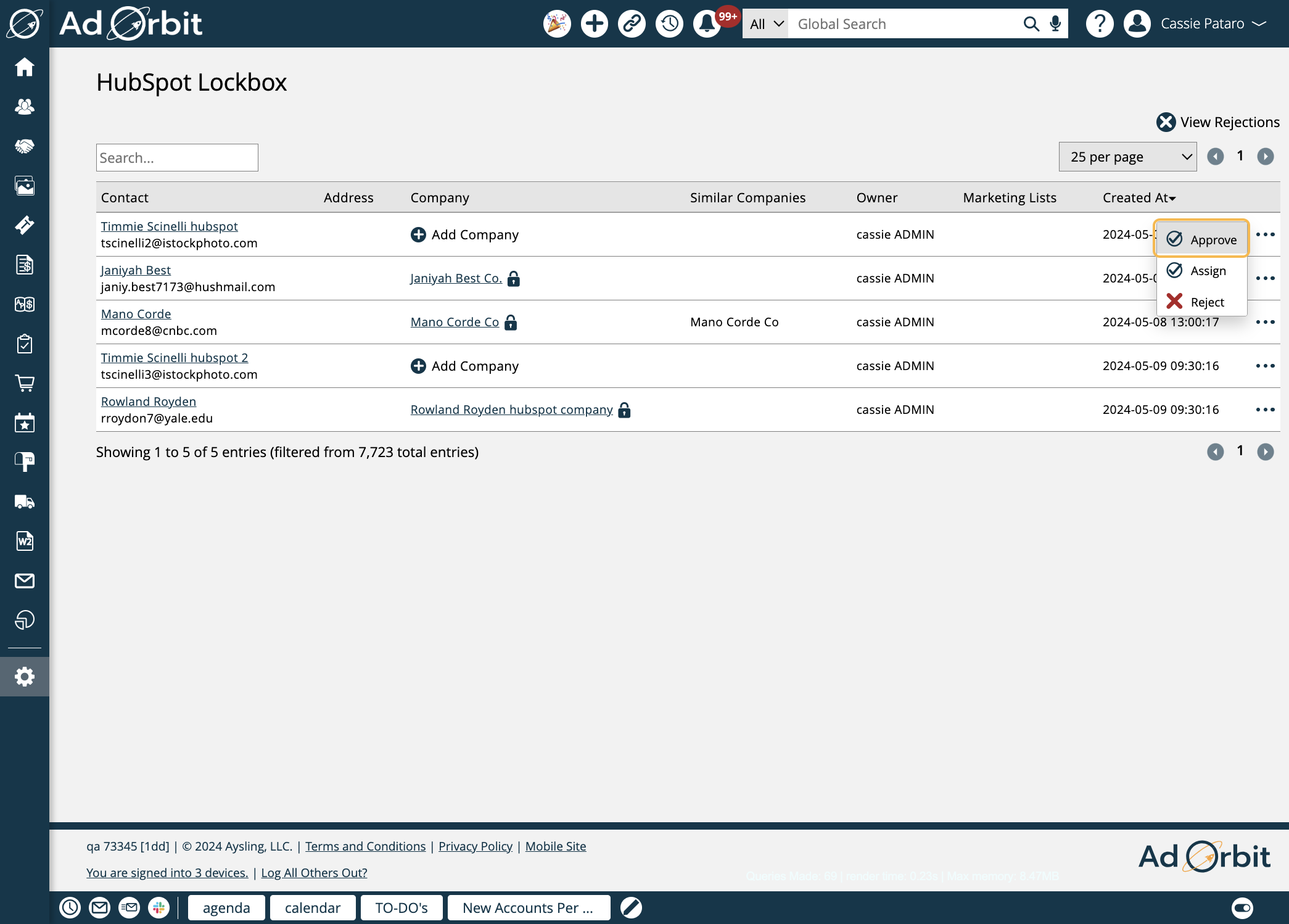 There are multiple actions that can be taken by clicking the ellipses icon. The first is to approve the contact. Approving the contact will create the record within Ad Orbit.