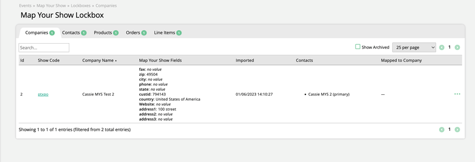Each record in the lockbox will show information about the item, including relevant IDs, names, MYS fields, and when it was imported into the system. There are multiple tabs for the different items that can be pulled in from Map Your Show.