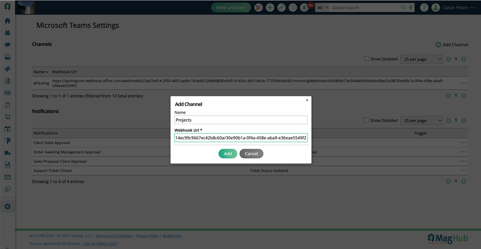 Now that you have a Webhook URL generated, navigate back to Settings > Integrations >Teams in Ad Orbit. Click the Add Channel button. In the popup, name your channel, and paste the Webhook URL. Click Add to create the channel.