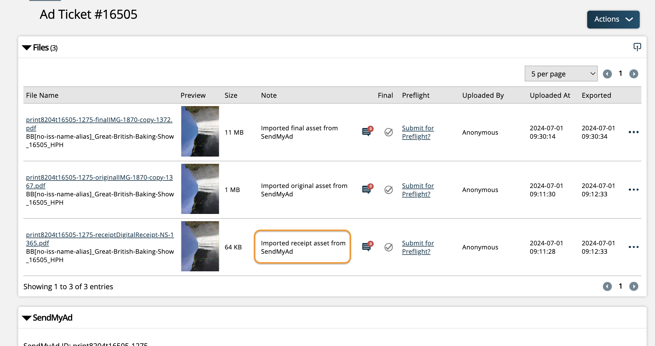 Assets added to synced SendMyAd items will be automatically added as assets to the corresponding Ad Orbit ticket. When synced, the ticket will automatically get the ‘Ad Arrived’ status set.