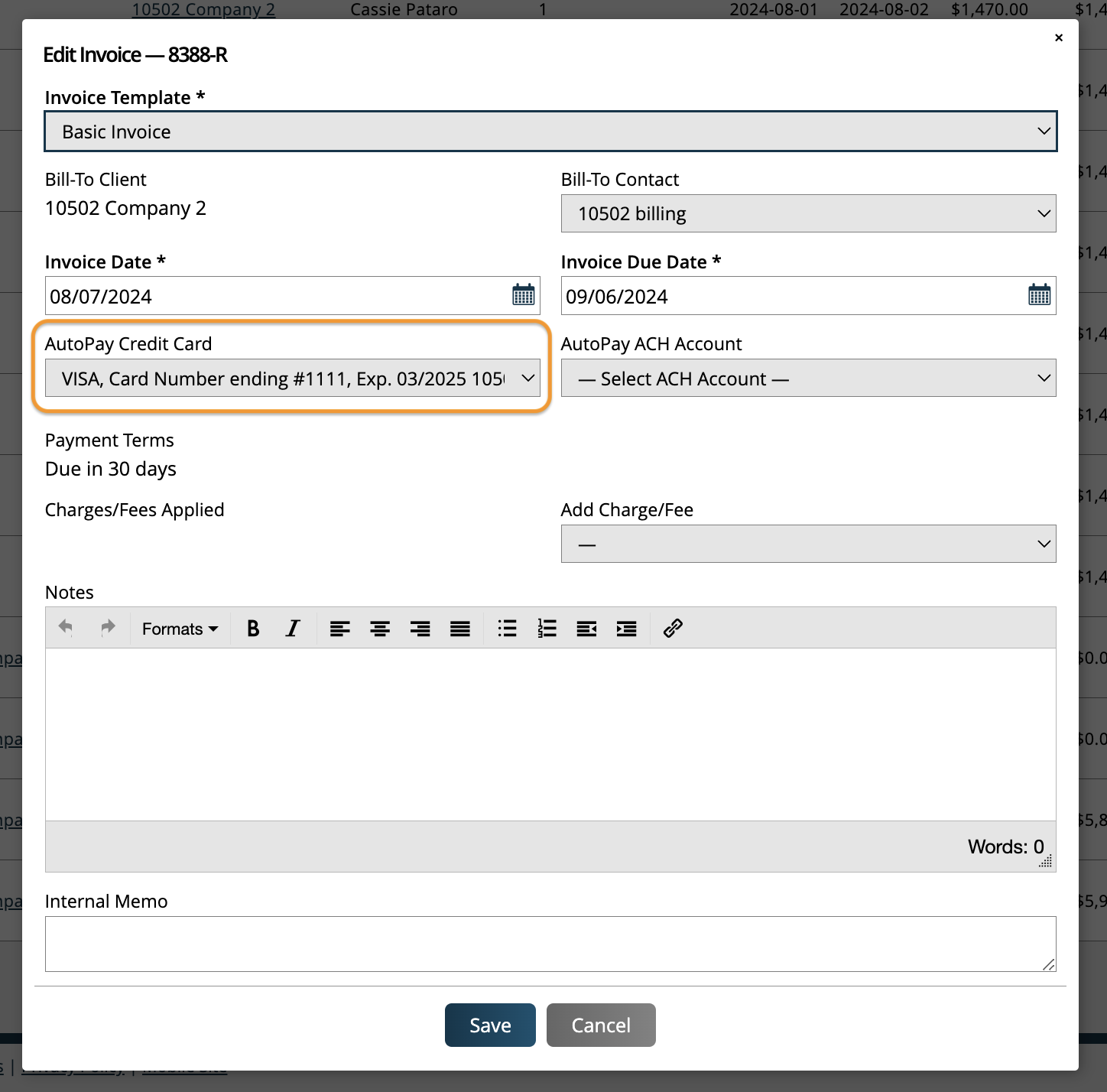 On the Billing and Notes step of creating an order, or from the Edit Order popup once fully approved, you can associate a credit card with the order. If set, this card will be automatically associated with all invoices created for the other, and will be used as an auto-pay card for those invoices.