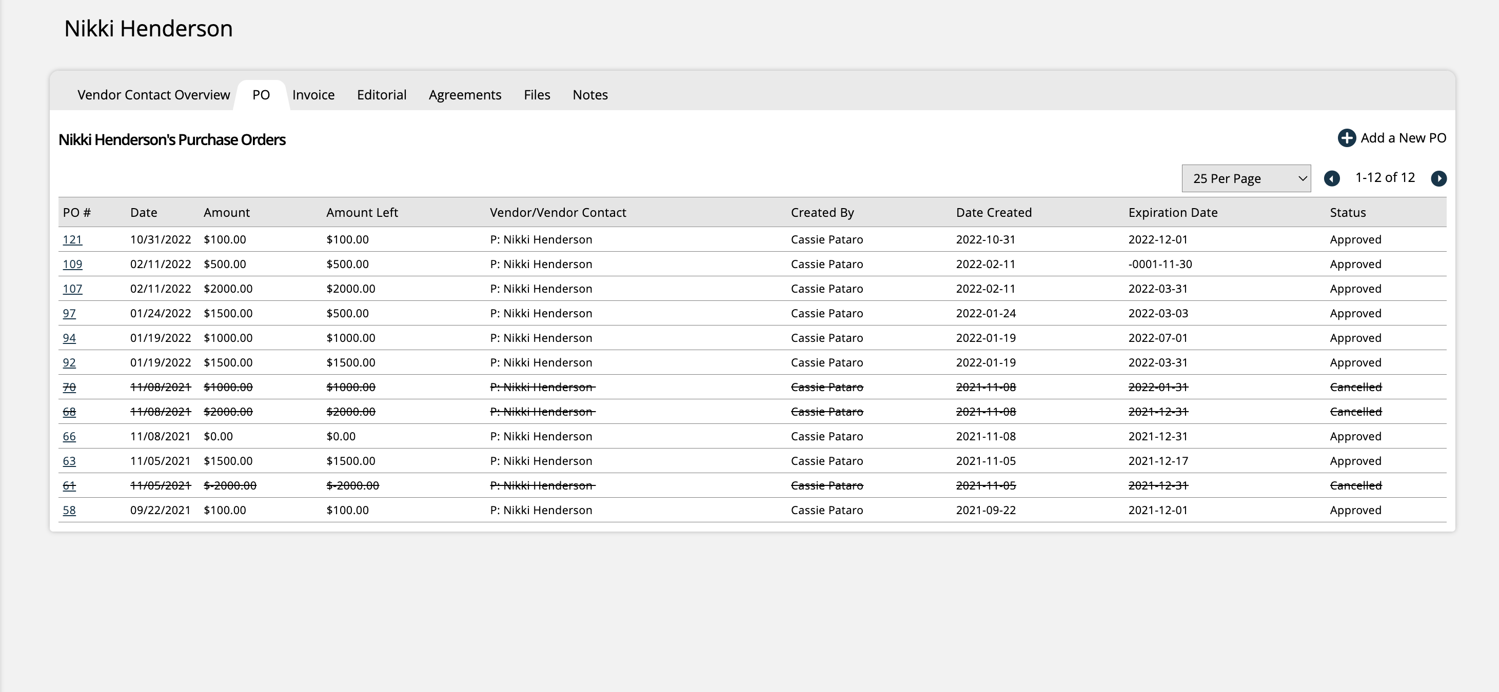 The PO number is a quick link which will open the purchase order details in a new tab. Depending on your permissions, you may also be able to create a new PO for the vendor contact from this page.