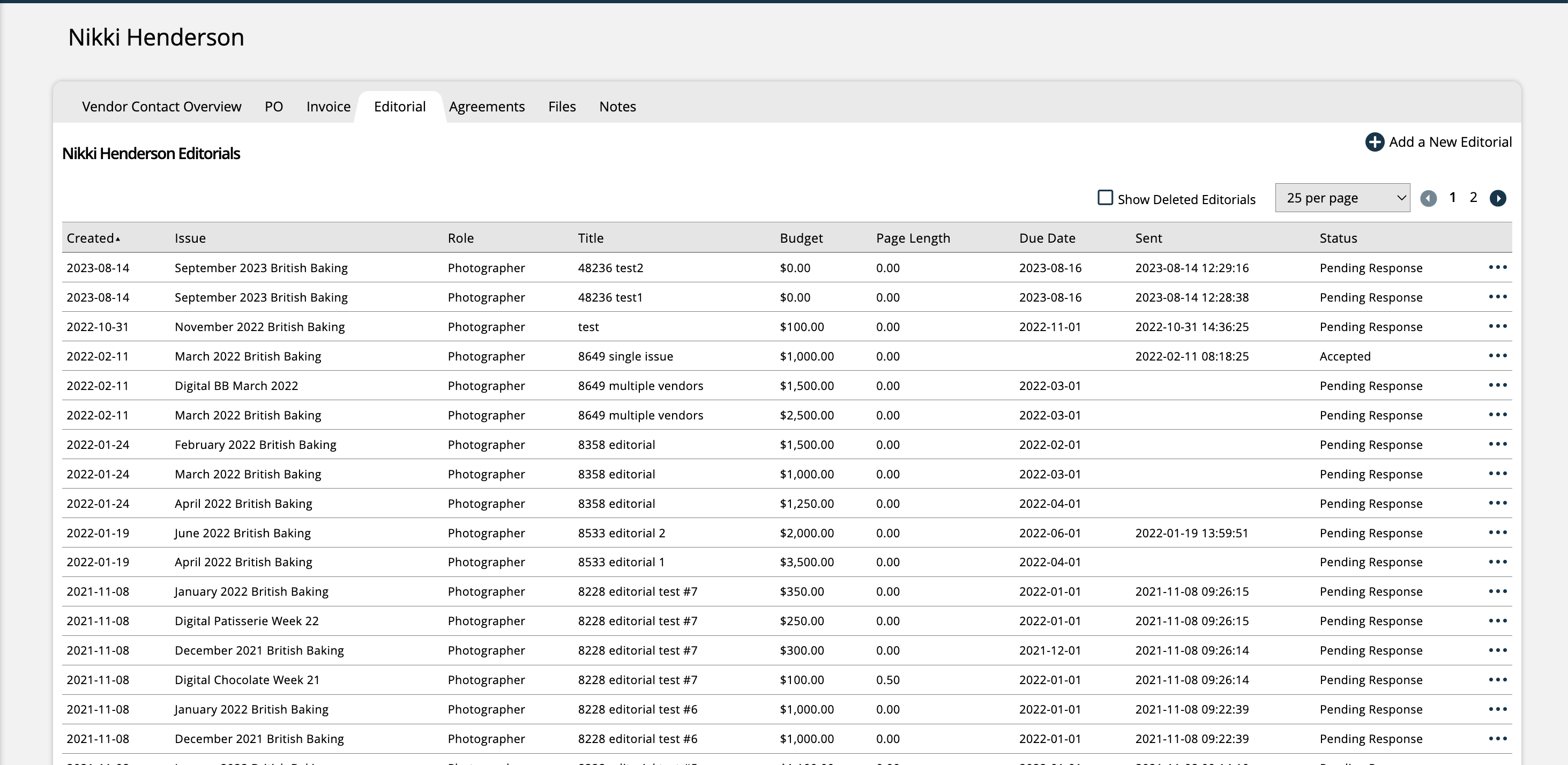 Any editorial agreements for the vendor will show up on this page. Only vendor contacts that are Writers or Photographers (which are vendor contact types) can have editorial agreements. Each agreement will show some information including agreement name, budget, and status.
