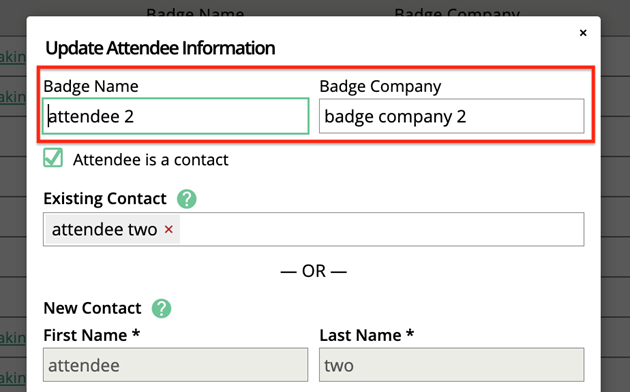 If a badge name is provided, that name will display in the Badge Name field, and will override the contact name.