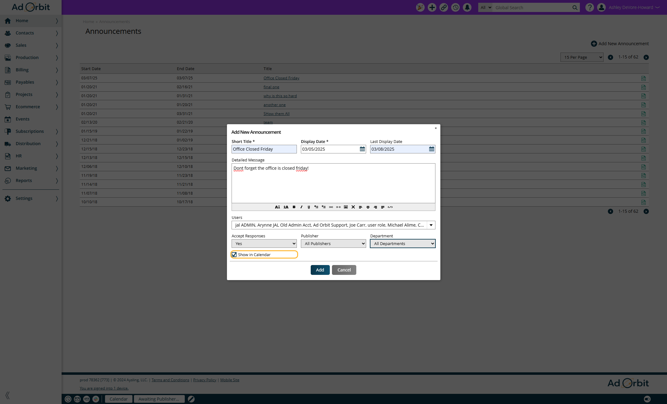 You can easily send system-wide announcements to your team members, ensuring that important messages are visible to everyone. Once sent, the announcement will appear at the top of each user's screen. Additionally, you have the option to include the announcement on users' calendars—provided that the users have enabled the display of announcements in their calendar settings.