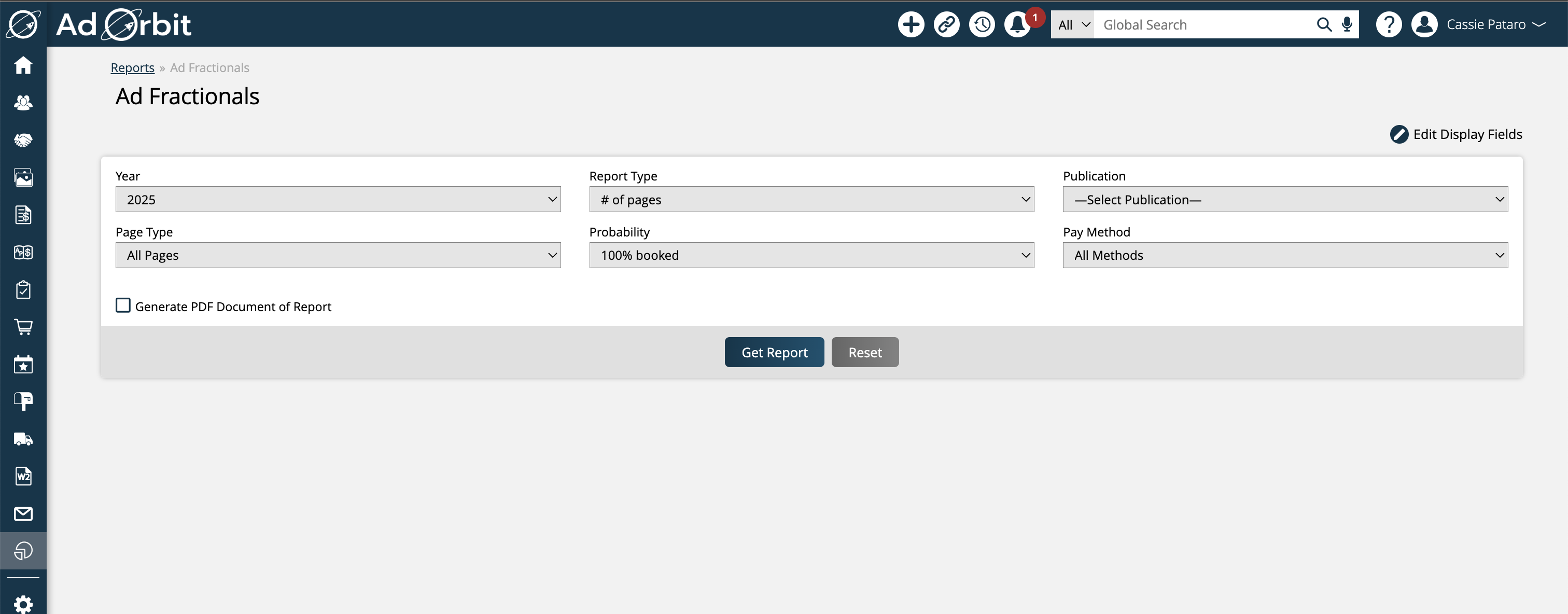 The reports show how many ads have sold based on size. You should use this report if you want to know the number of page sizes you have sold, the APR, and how much each ad size is discounted. You can filter the report by year and publication.