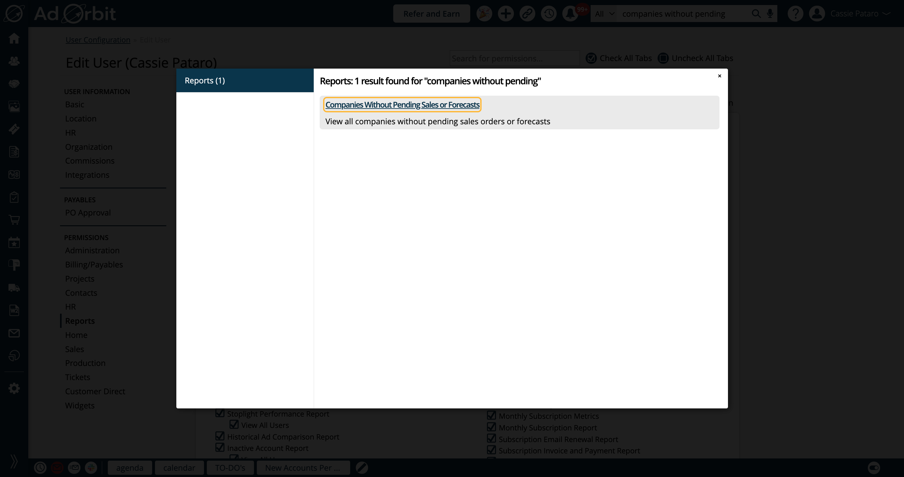 You can find the Companies Without Pending Sales or Forecasts Report by going to Reports > All Reports and clicking on the report name. Or, you can use the global search bar.