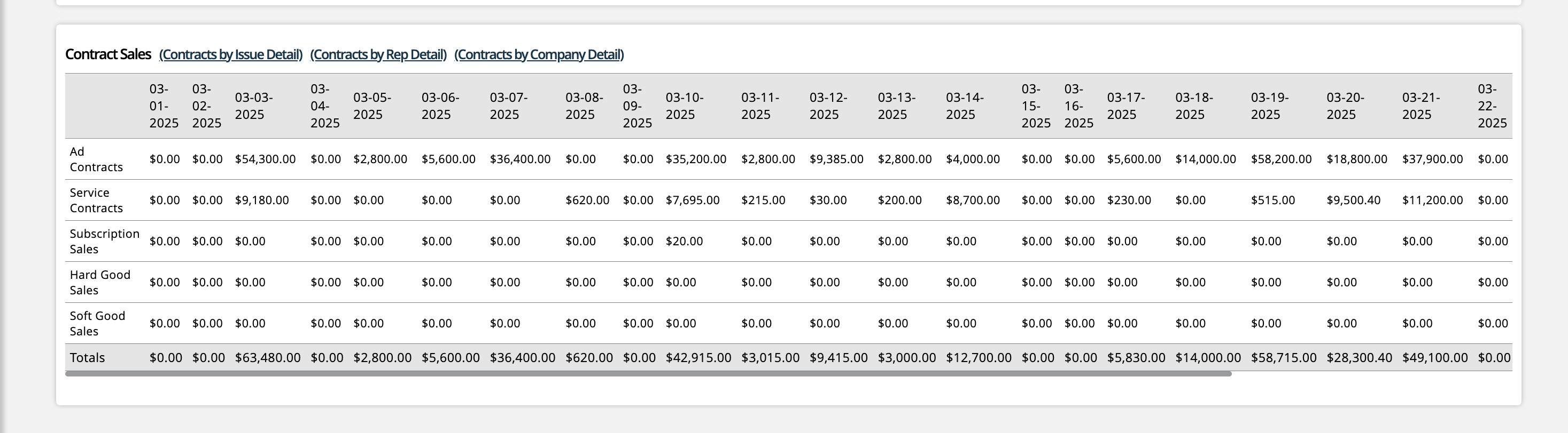 The detail tables are formatted in the same way as the main tables, where sales are broken down per day, but instead of categories as the rows of data, the tables will display specific Issues, Reps, or Companies. This format allows you to see daily sales both in a summary view, and in a detailed view by further breaking down the data into Issue, Rep, or Company for both Confirmed and Contract Sales.