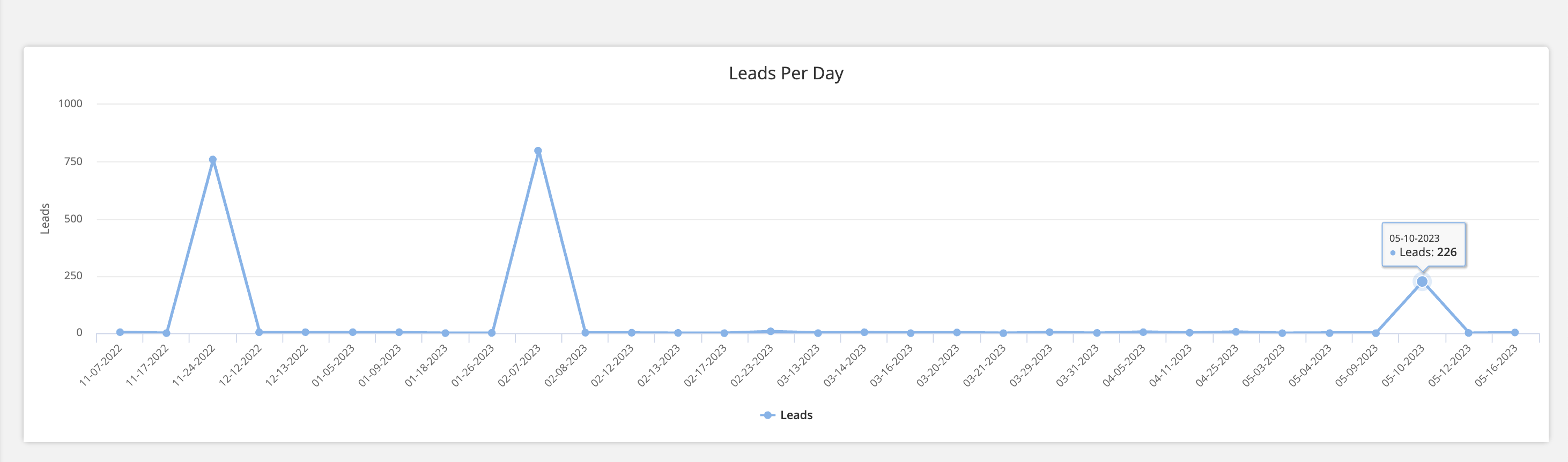 Show Lead Per Day Chart: If this option is chosen, in addition to the table, the report will show a chart of the leads generated per day, for the date range searched. Hovering over one of the data points will show the exact number of leads generated.