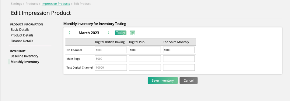 Baseline Inventory is set up based on the channels and publications on the product. For instance, if you have two channels and two publications on your Impression product, you’ll see two columns (one for each pub), and three rows (one for each channel, and one row for ‘no channel’).