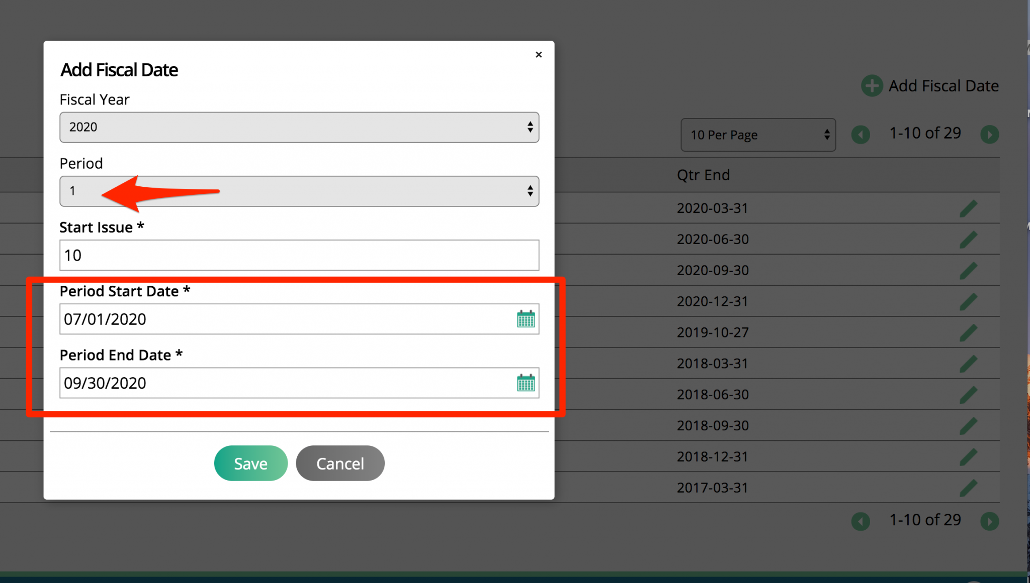 You need to set up all four periods for each year. Each period represents a quarter of system reports. If your fiscal calendar matches the calendar year, your fiscal calendar should be set up as follows:
