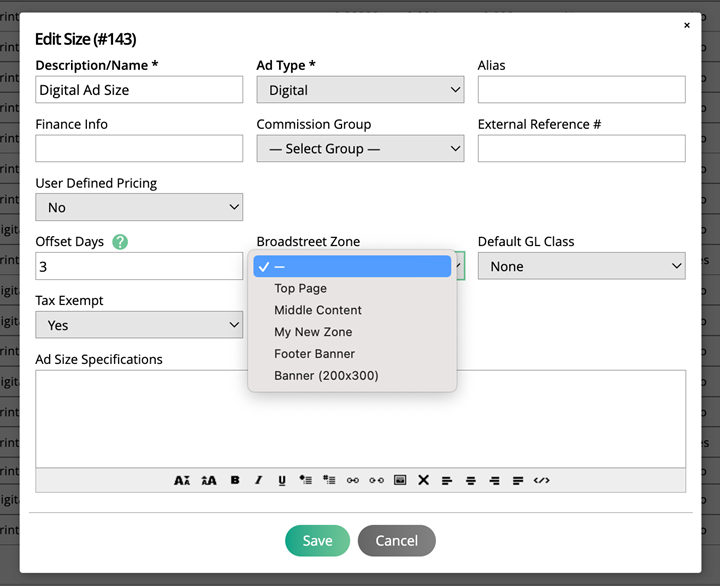 Edit or add a digital ad size, and in the popup, you will see a dropdown for ‘Broadstreet Zone’. Here, you will be able to choose from all your existing zones in Broadstreet to map to the ad size.