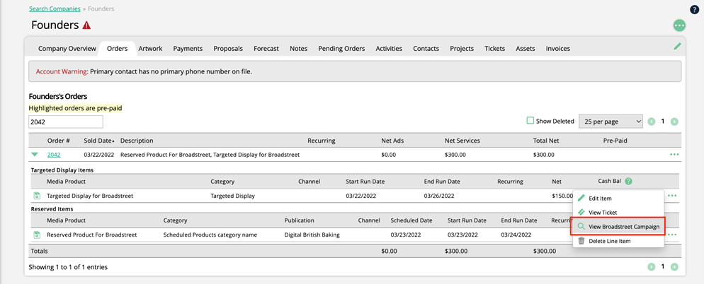 Once a line item is synced with Broadstreet, you can view Broadstreet campaign information about that item from within the system, and within the Client Center.