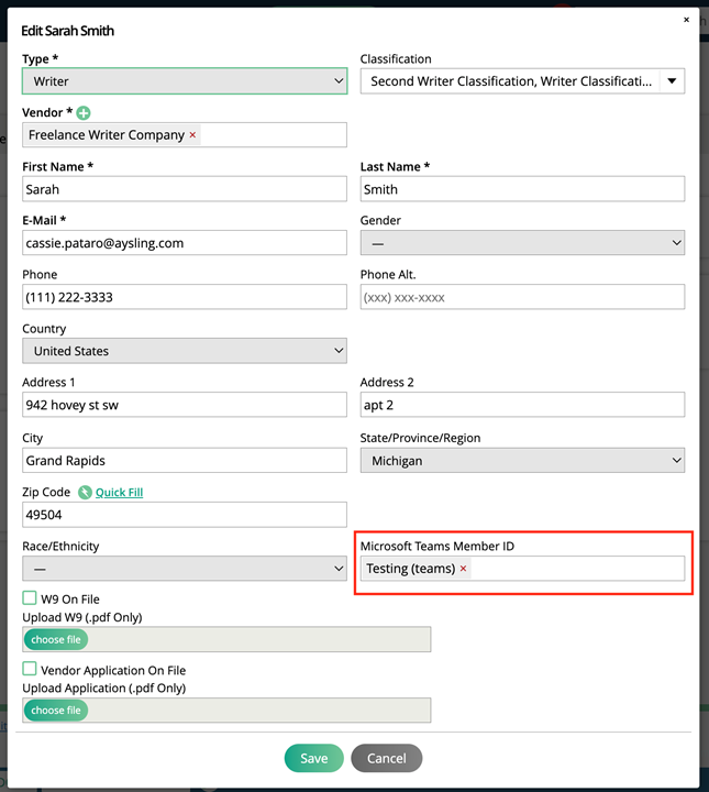 To add a Teams channel to a vendor contact, navigate to the vendor contact’s overview page in the system, and open the edit popup. Add a Teams channel into the Microsoft Teams Member ID field.