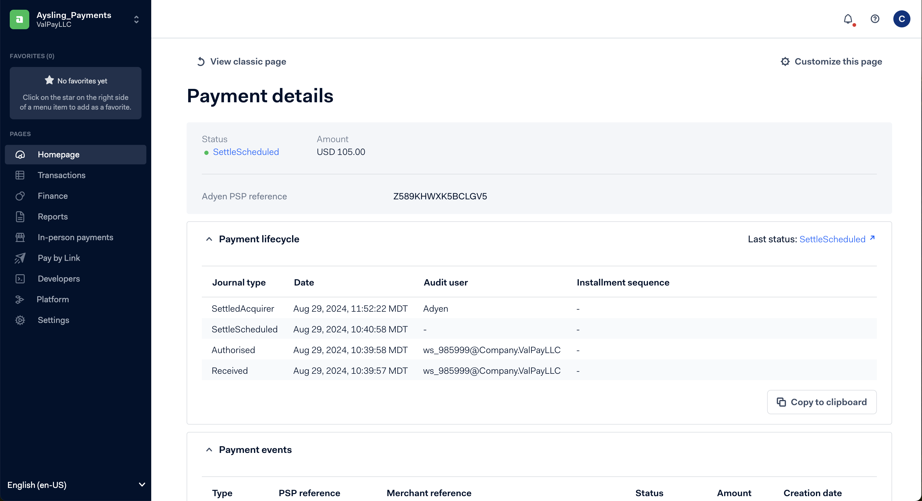 Payments processed in your instance will show up in Aysling Payments where you can view and interact with the processed transactions. Clicking on a transaction ID in Aysling Payments will display more details about the transaction, such as the order, payment, and customer billing information.